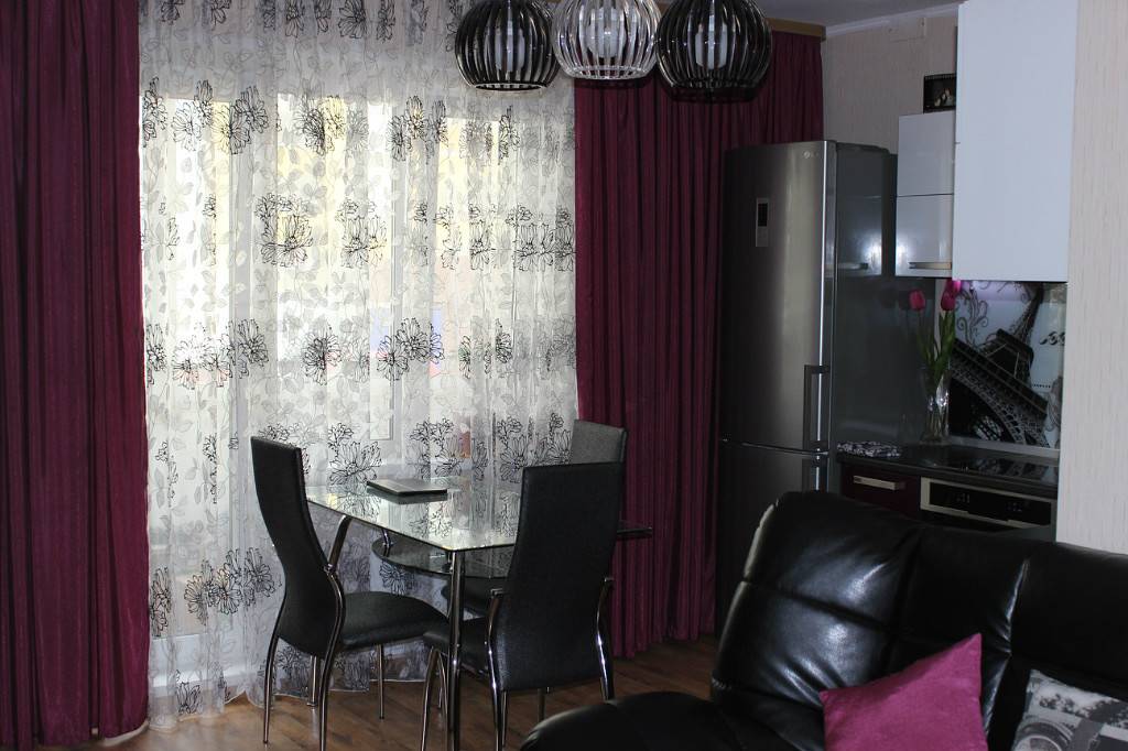 - Если в помещении присутствуют активные элементы пурпурного цвета, то выбирая шторы, необходимо предпочесть хлопковую или льняную ткань довольно спокойных оттенков. В таком интерьере не будут смотреться тяжелые гардины со складками и бахромой, а также занавески в цветочек – аналогичные элементы в соединении с колоритными оттенками практически всегда выглядят нелепо.