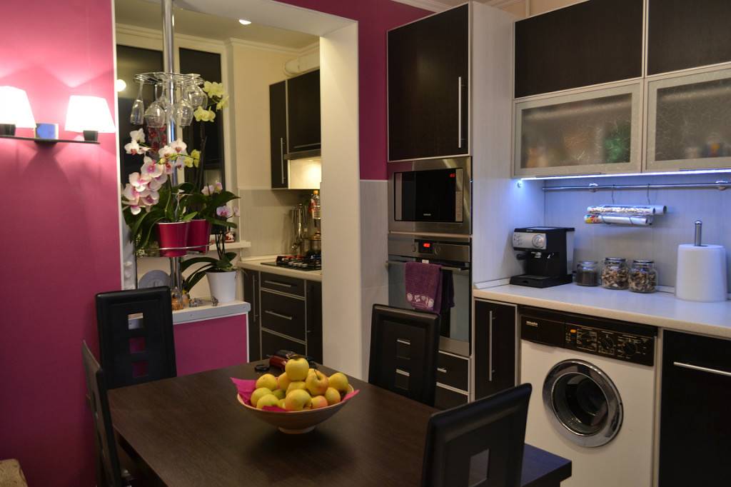 - Чёрно-белая классика и фуксия. Немного способны успокоить фуксию белоснежная и серая гамма, даже с некоторыми внедрениями чёрного. Все эти нюансы следует учитывать при создании дизайна кухни своими руками, а также надо иметь в виду, что там не должно быть контраста ради контраста. Это лишь некоторый способ создать выразительный и весьма организованный интерьер.