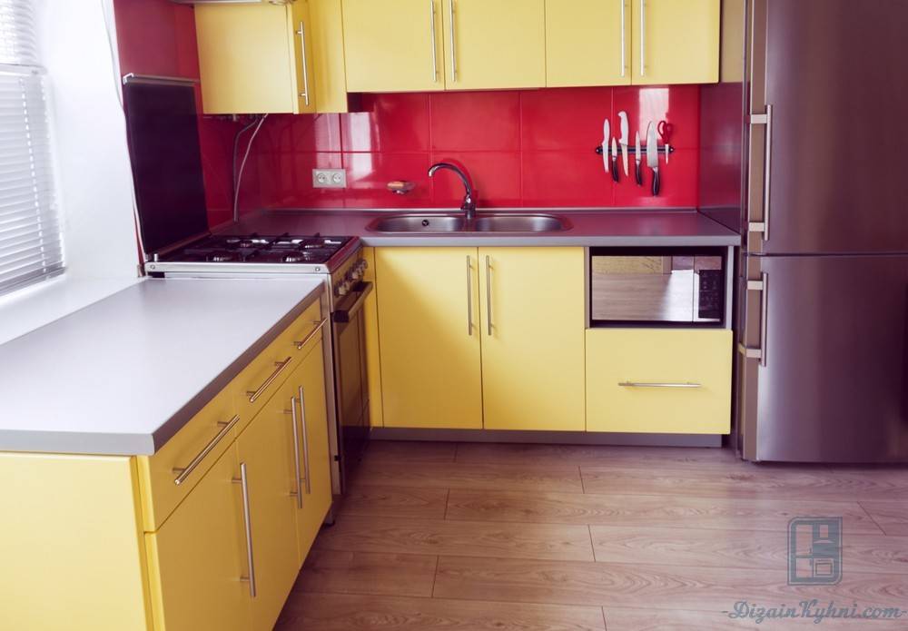 Желтые стены на фоне темных фасадов привлекают внимание, а отсутствие верхних шкафов позволяет сделать маленькую кухню визуально более свободной