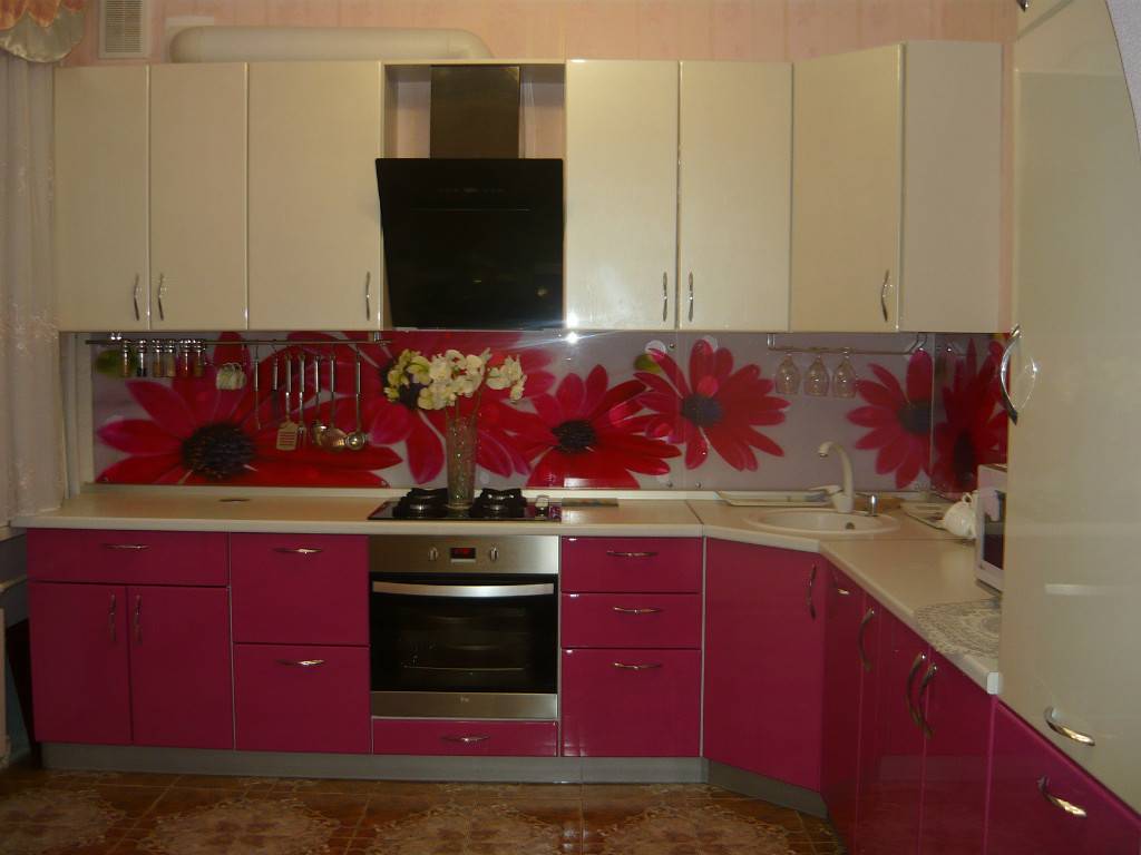 Подобную кухню можно оформить практически в любом стиле интерьера: от классического до хай-тека, если выбрать подходящие тона. Эффектный прием — комбинация белых шкафчиков и нижних ящиков цвета фуксии. Таким образом кухня выглядит гармонично и, как ни странно, визуально становится выше и просторнее.