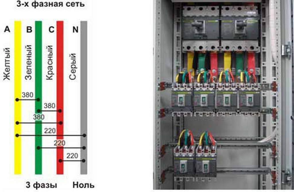 Не будет лишним показать цветовое обозначение шин и проводов для трех фаз: