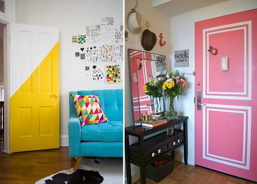 Окрашивание двери поможет акцентировать внимание и разбавить интерьер. Чтобы выполнить покраску, придется снять дверь с петель. Ее предварительно отшлифовывают, заделывают трещины и мелкие дефекты