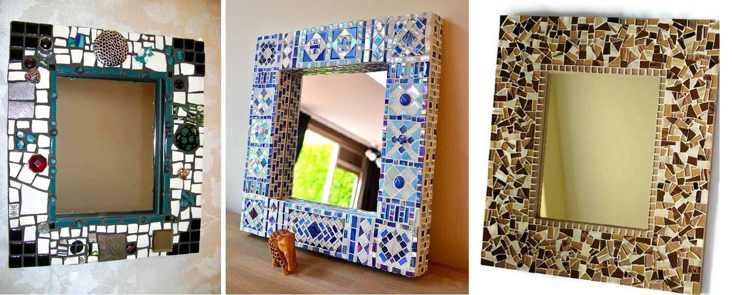 Всегда уместны рамы из мозаики, которую можно сделать из осколков посуды, плитки, цветного стекла или украшений. При желании необходимые материалы для создания мозаики вы легко приобретете в специализированном магазине.