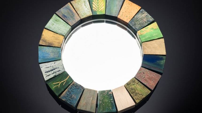 Дерево – один из лучших материалов для декорирования зеркала. Можно использовать как цельные доски, так и спилы веток. Чем крупнее зеркало, тем больше ему будет подходить подобное обрамление.