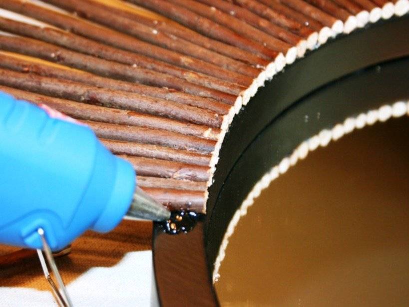 2. Зеркало с лицевой стороны закрыть бумагой и малярным скотчем. На раму с изнанки нанести диагональную «разметку» для будущих лучей. К ней прикрепить при помощи клеевого пистолета длинные и толстые ветви, удерживая каждую по 10-20 секунд, пока клей схватится.