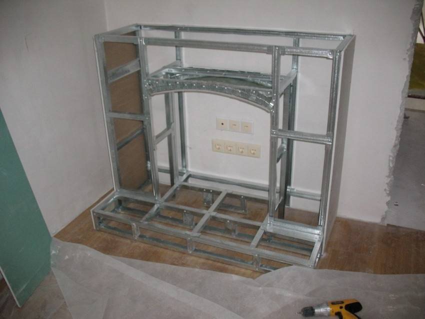 - Постепенно соберите каркас полностью, обязательно сверяясь с чертежом, иначе вы легко запутаетесь, и изделие получится неровным. Для большей устойчивости очага на боковых и задней стенке прикрепите к основному каркасу поперечные перемычки из того же профиля через каждые 30 см. Если вы решили оснастить изделие арочкой, то не забудьте сделать надрезы бортиков профиля, и немного его изогнуть, придавая округлую форму.