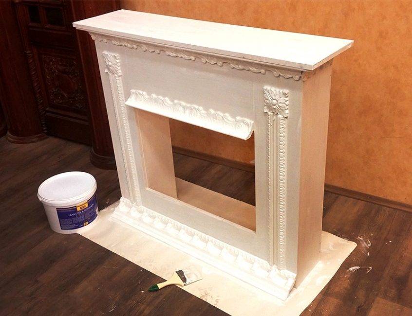 Приклеиваем плинтус и декор из пенопласта к фальш-камину.