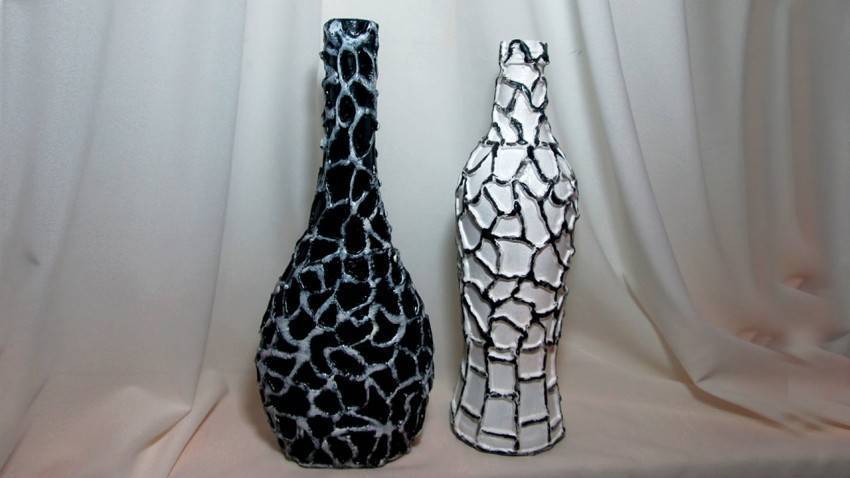 Стеклянную поверхность нужно обрабатывать в перчатках, чтобы не оставлять отпечатков. Технология работы над бутылкой различна. Применяют не только салфетки , но и шнуры, шпаклёвку, и декоративные элементу.