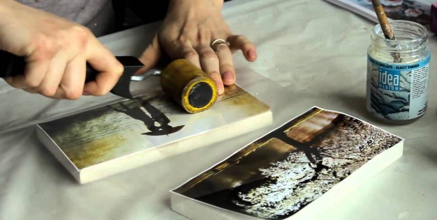 - Наложение салфетки на сухую основу и нанесение клея или лака сверху. Тонкая салфетка пропитывается насквозь клеевым составом и прикрепляется к основанию.
