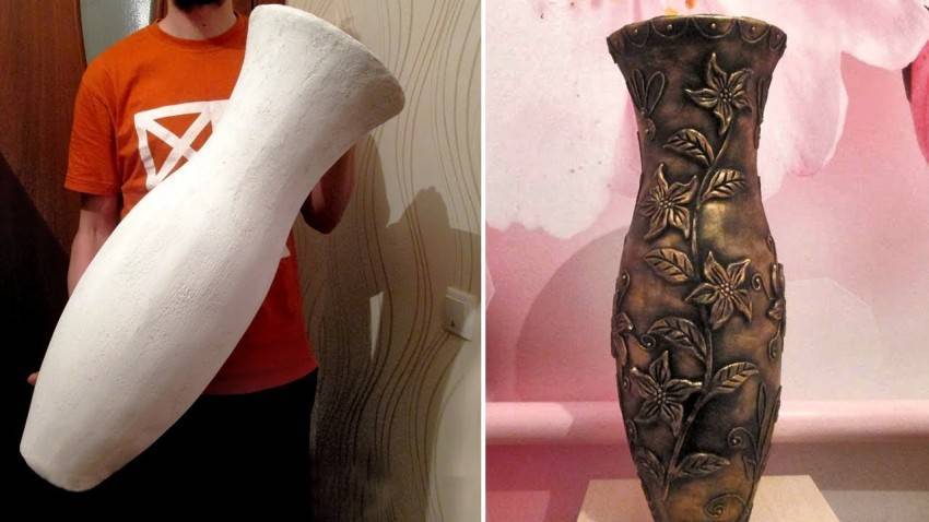 Вазу предварительно обрабатываем наждачной бумагой до появления мелких трещин. Далее грунтуем изделие специальным составом. Жидкость предотвратит отслаивание деталей в процессе эксплуатации изделия.