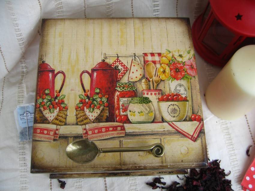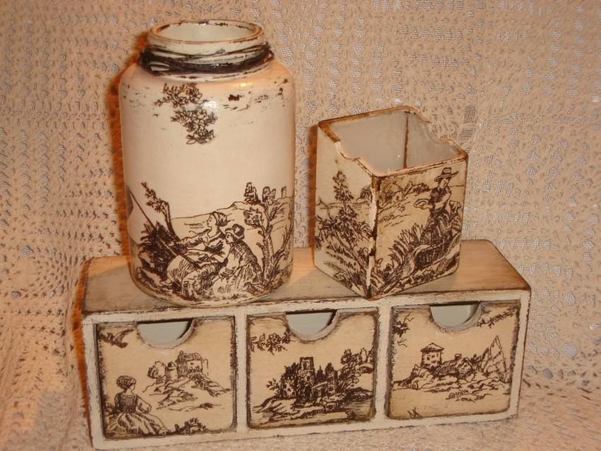 Ниже размещены фото — несколько вариантов изделий в технике декупаж, выполнить которые будет по силам для начинающих мастериц.