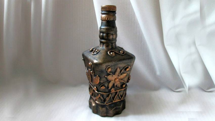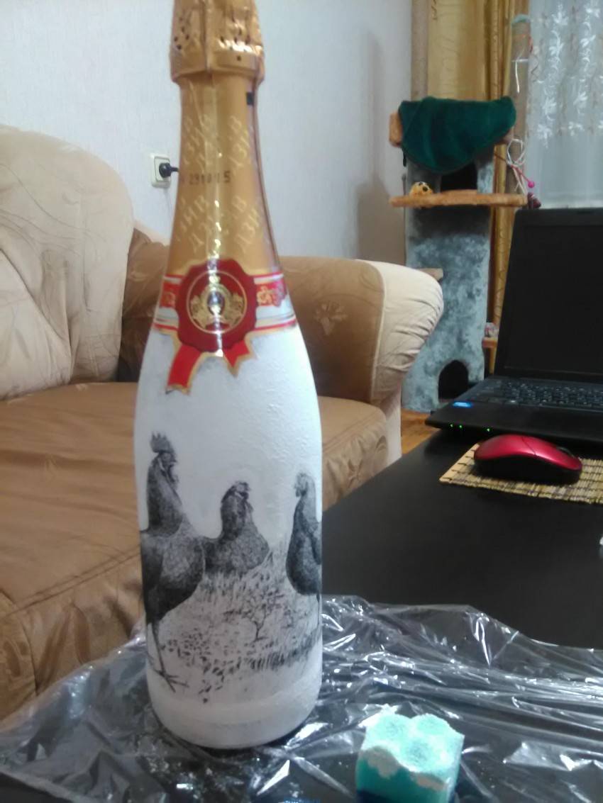 Стеклянную поверхность нужно обрабатывать в перчатках, чтобы не оставлять отпечатков. Технология работы над бутылкой различна. Применяют не только салфетки , но и шнуры, шпаклёвку, и декоративные элементу.