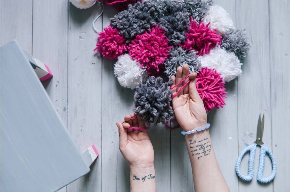 Из старого стульчика с потертостями и царапинами несложно сделать красивый и стильный предмет интерьера. Приготовьте краски, малярный скотч и цветные шерстяные нити, чтобы сшить для стульчика милую подушечку с помпонами.