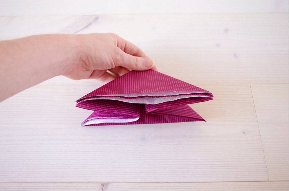 Переворачиваем на обратную сторону и сгибаем вершину к основанию.