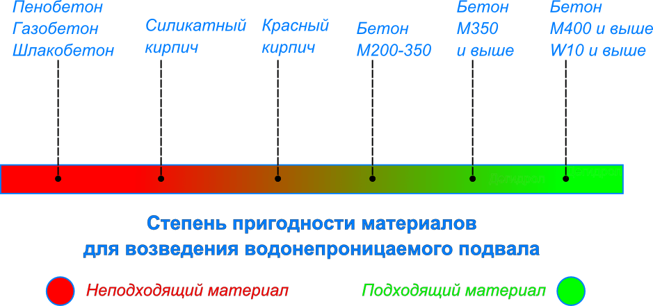 Построить погреб своими руками при высоком уровне грунтовых вод из железобетона не является непреодолимой задачей. Главное здесь – подготовить бетонную смесь необходимого класса прочности. В таких условиях применяется бетон В35 (М450). Непроницаемым для воды он становится благодаря гидроизолирующим добавкам.