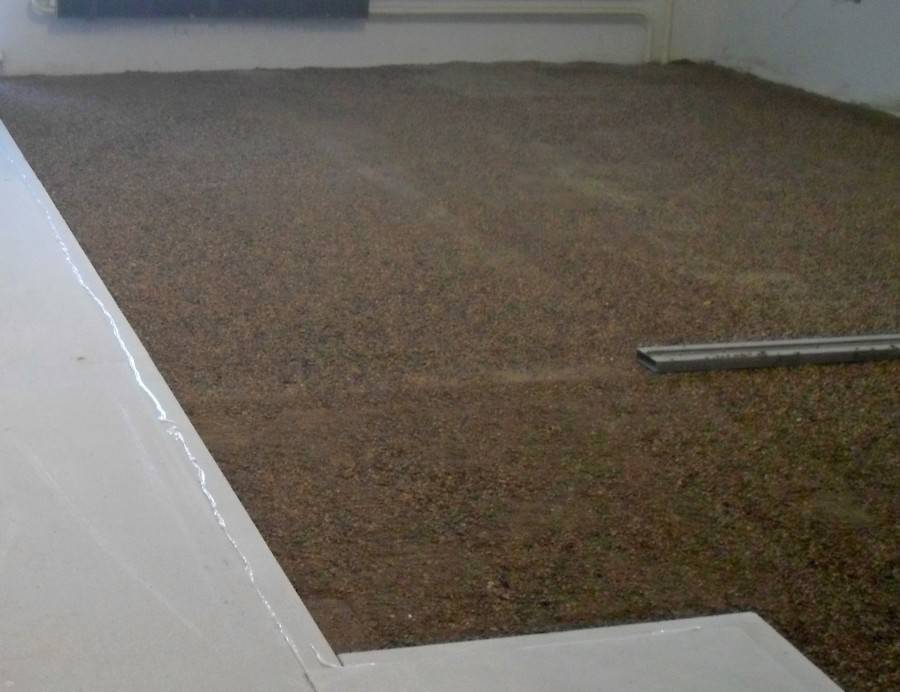 - Теперь можно залить черновую стяжку, замешанную на гравии или керамзите вместо песка. Её наливают на песок и хорошо выравнивают. Дают полностью высохнуть.