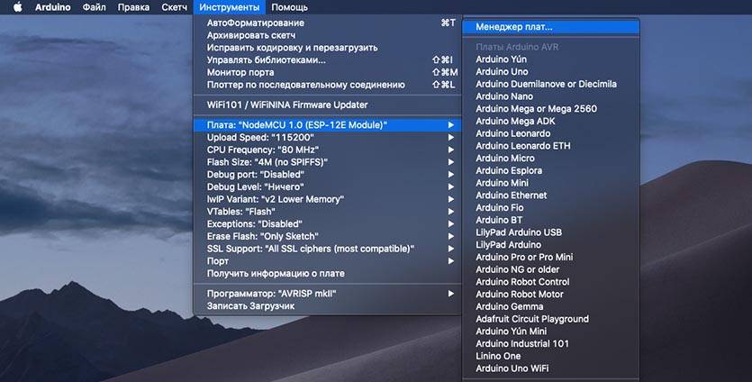 10. В меню Инструменты – Плата выбираем используемую плату Wemos D1 mini или NodeMcu.