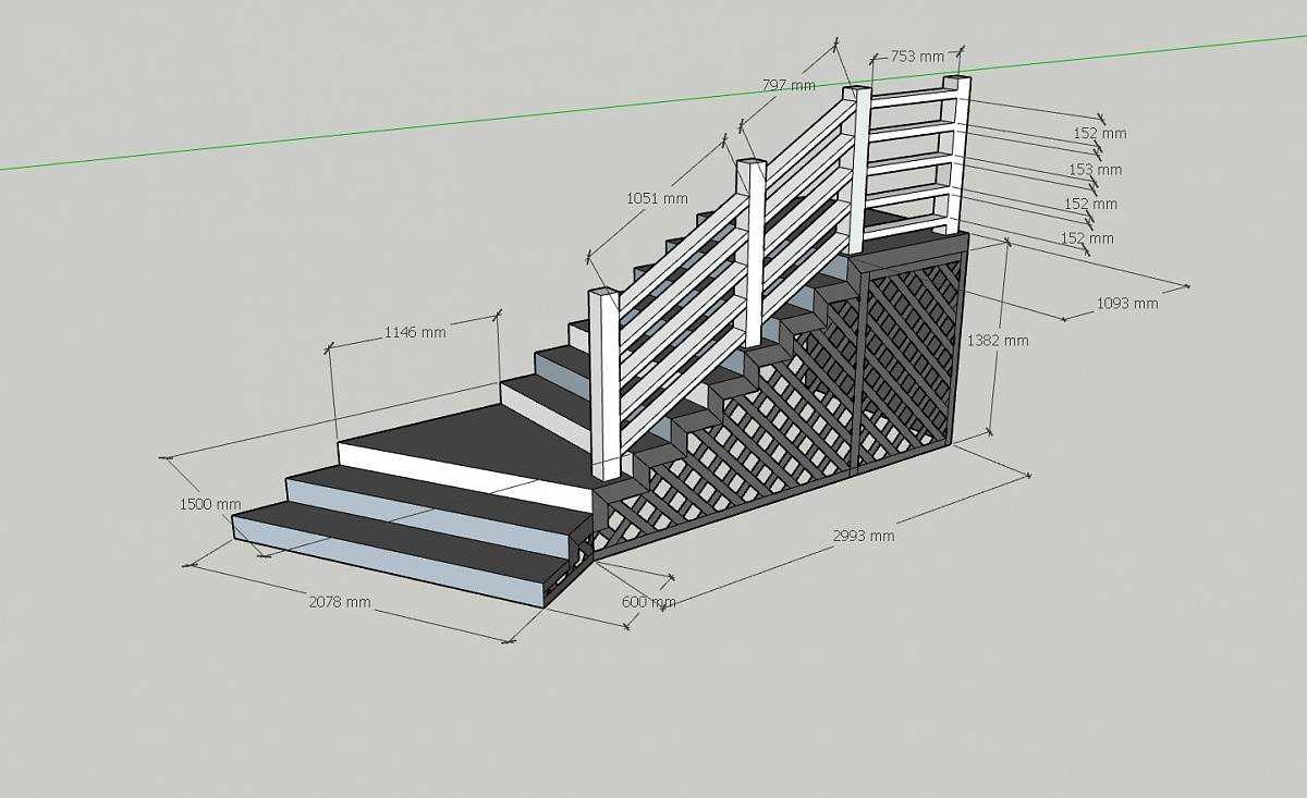Для того, чтобы постройка крыльца прошла быстро и качественно, нужно тщательно рассчитать материалы и порядок проведения работ. Если вы нанимаете компанию или мастеров, настоятельно рекомендуется заранее сделать чертеж, а лучше 3D-модель каркаса и самого крыльца, чтобы избежать непонимания и косяков.