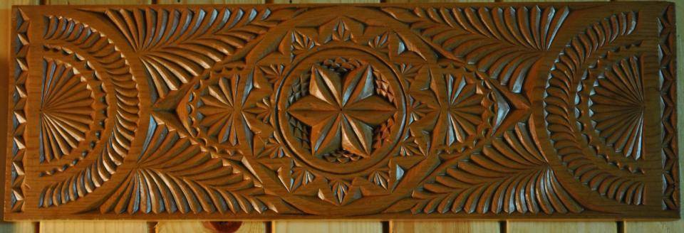 Это довольно сложная и кропотливая работа, которая заключается в том, что с помощью стамесок и специальных ножей, на поверхности древесины создается рисунок, элементы которого состоят из геометрических фигур. На фото ниже показан пример такого