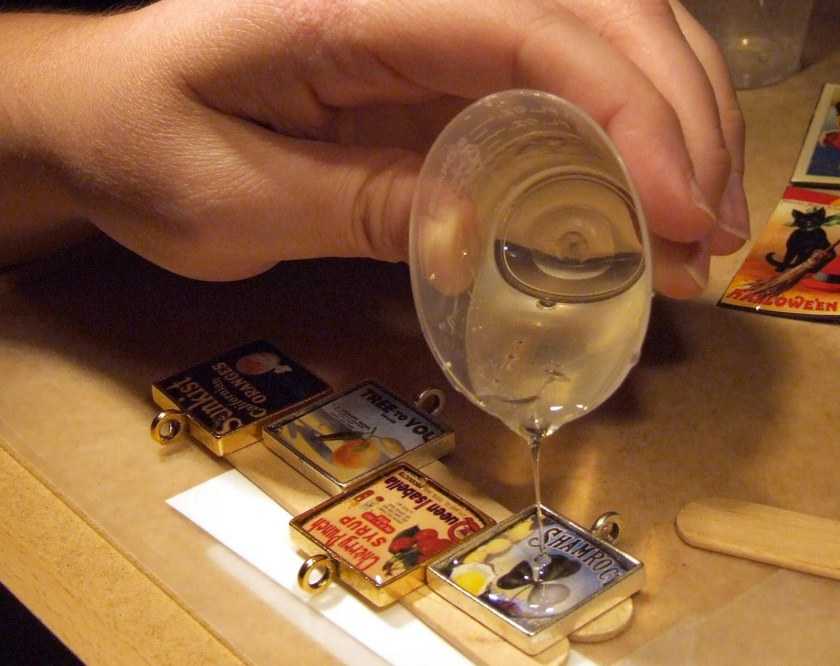 Если модель полностью эпоксидная, без деревянной основы, изображение формируют в толще скульптурного пластилина. Технология смешивания компонентов и заливки формы неизменна. Время полного затвердения кулона – около суток.