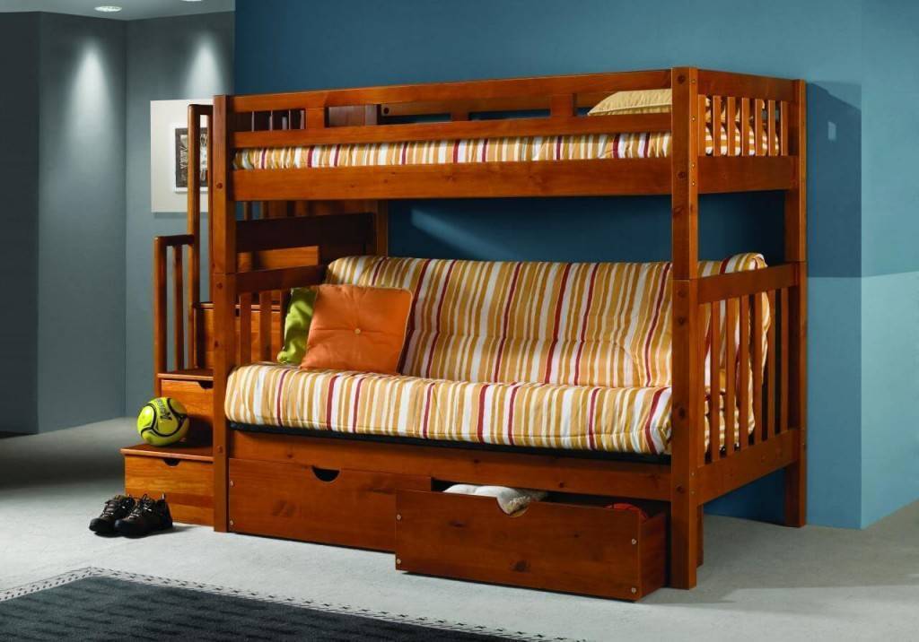 - Гарнитур, оснащенный диваном на нижнем ярусе. Хорошее решение для общительного ребенка, часто устраивающего встречи с друзьями. Есть модели комплектов с раскладной мебелью для отдыха. В этом случае она может использоваться как дополнительное спальное место. Это удобно, если в семье два ребенка.