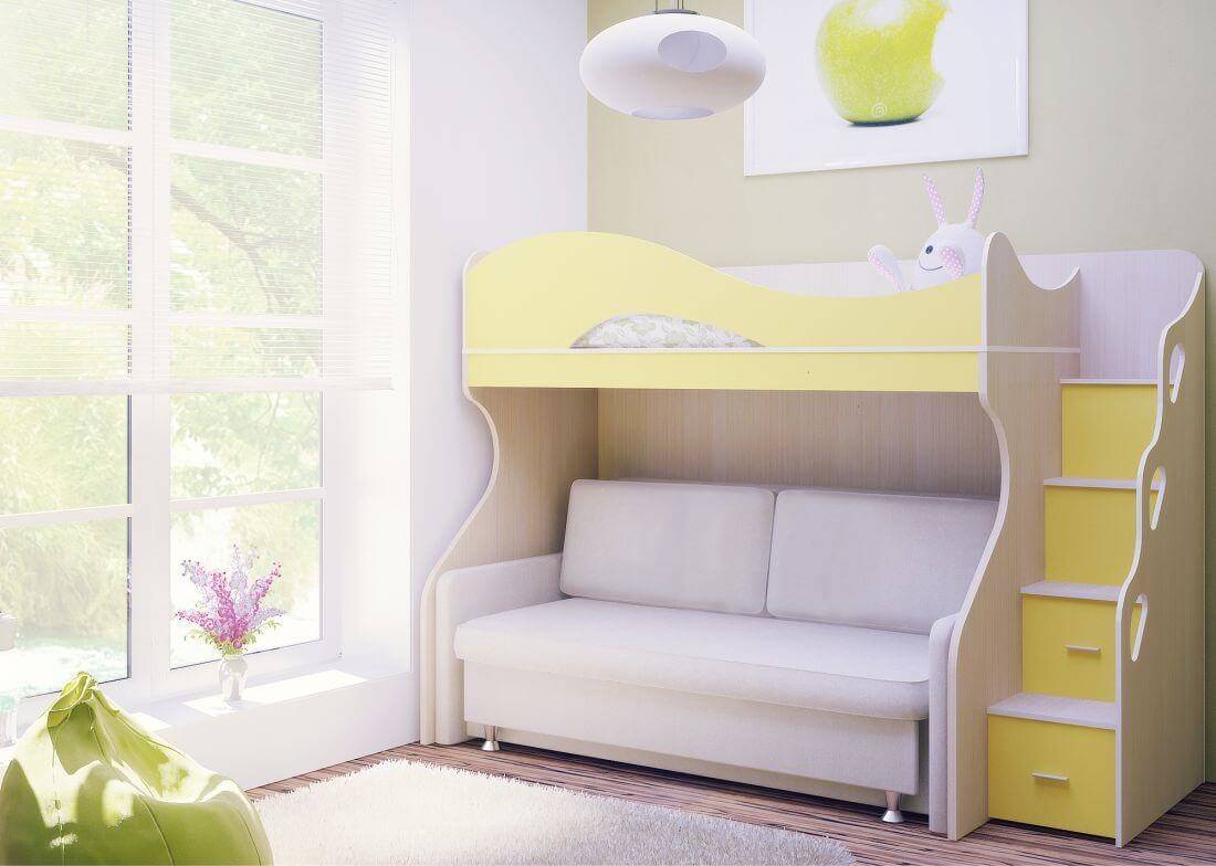 - Гарнитур, оснащенный диваном на нижнем ярусе. Хорошее решение для общительного ребенка, часто устраивающего встречи с друзьями. Есть модели комплектов с раскладной мебелью для отдыха. В этом случае она может использоваться как дополнительное спальное место. Это удобно, если в семье два ребенка.