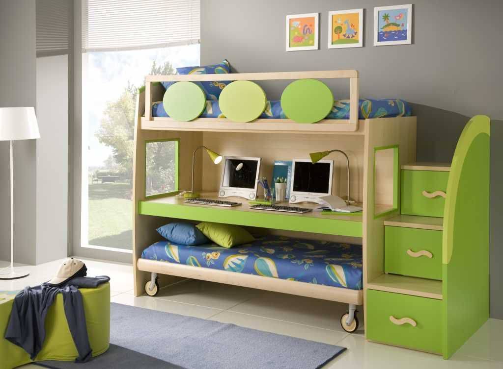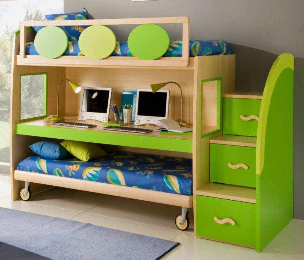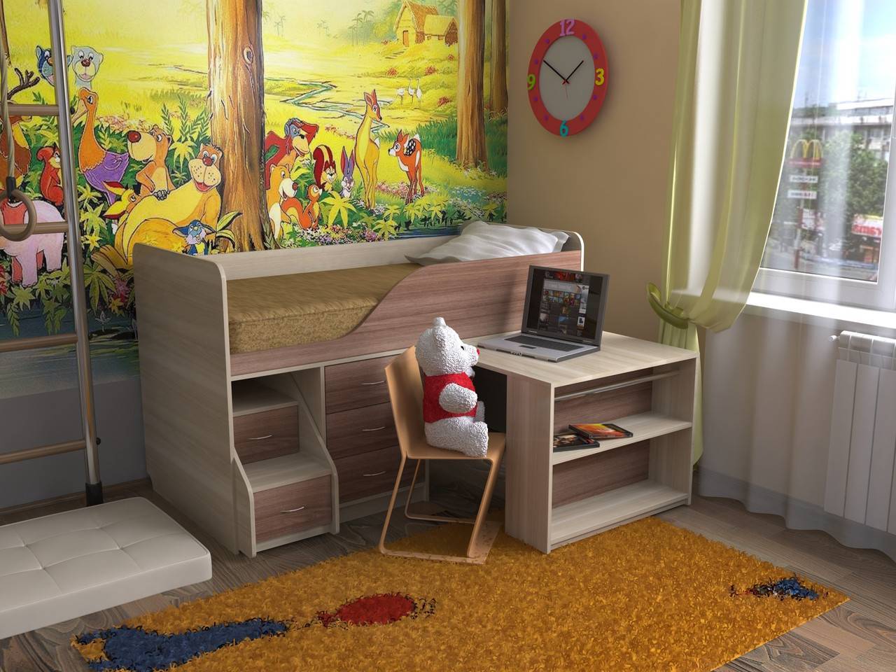 Если сама кровать находится на высоком уровне, то внизу можно разместить стол для компьютера или занятий уроками.