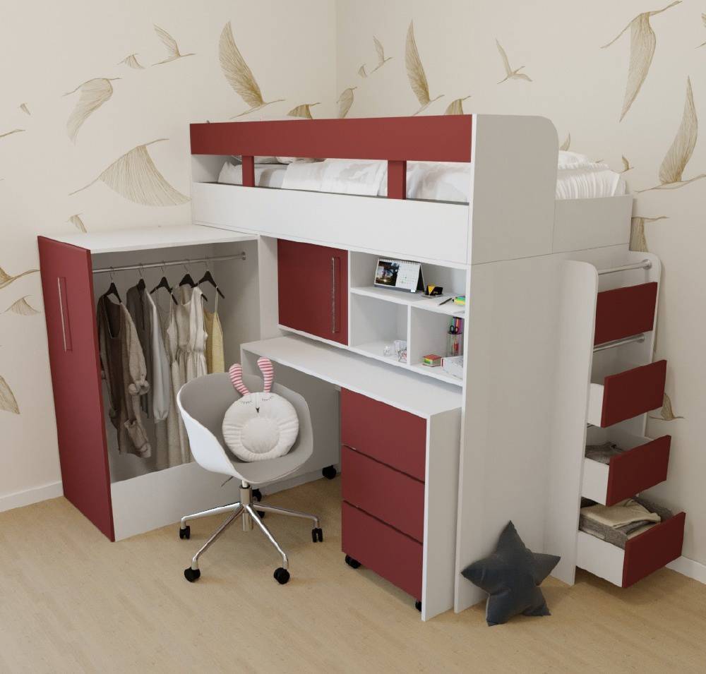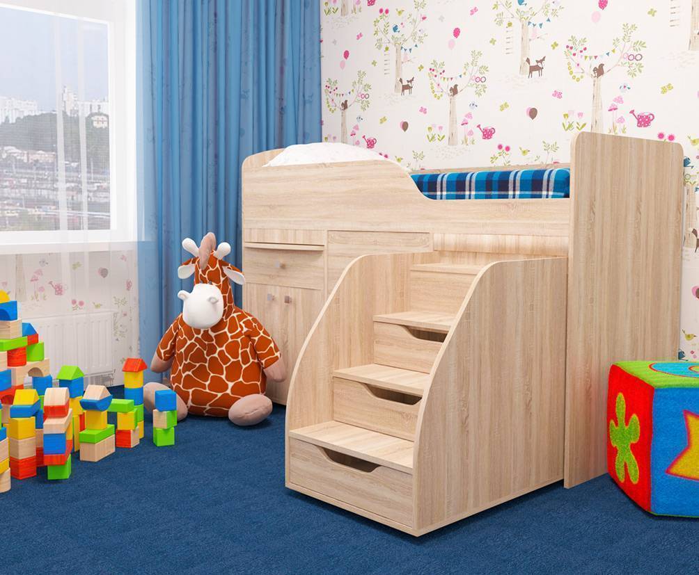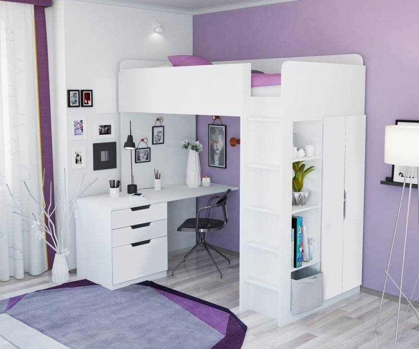 Кровать-чердак — многофункциональная и удобная детская мебель. Совмещение нескольких зон в вертикальной плоскости позволяет сэкономить свободное место. Конструкция представляет собой кровать, которая располагается на высоте от полутора метров от пола. Под ней может быть организован уголок для игр, диванчик, стол для занятий, ящики или шкафы для хранения разных вещей. К спальному месту ребенок поднимается по лестнице.