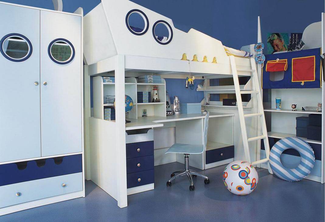 Под кроватью можно разместить игровую зону в виде палубы корабля совмещенного с элементами спортивного уголка: здесь можно повесить канат, кольца, установить турник, подвесную качель, удобную лестницу, по которой можно подняться на кровать, и небольшую горку, которая поможет легко и быстро спуститься вниз. Такой вариант будет интересен не только мальчикам, но и девочкам. Особенно он удобен в зимний период.