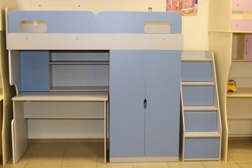 Достаточно популярная модель для одного ребенка при дефиците пространства. Состоит из шкафов и ящиков, стола и спального места, причем раскладываться или выдвигаться может как матрас, так и стол.
