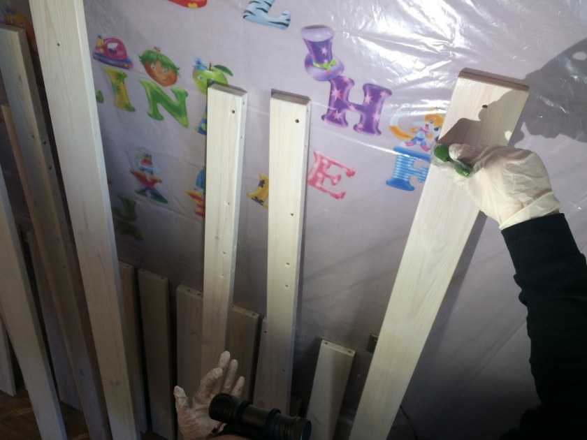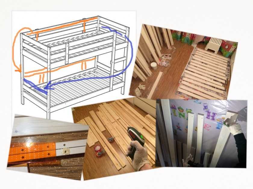 Из доски сбивается каркас изготавливаемой своими руками детской кровати-чердака, имеющий в каждом направлении большие на 20 см внутренние размеры, чем габариты матраса. Выполняется изнутри прикручивание рамки из бруса к нижнему торцу данного короба заподлицо. Из тонких планок производится реечное основание. Элементы должны быть на 20 мм короче, чем внутренние габариты короба. Планки располагаются на расстоянии 50-65 мм друг от друга и прикручиваются саморезами к рамке.