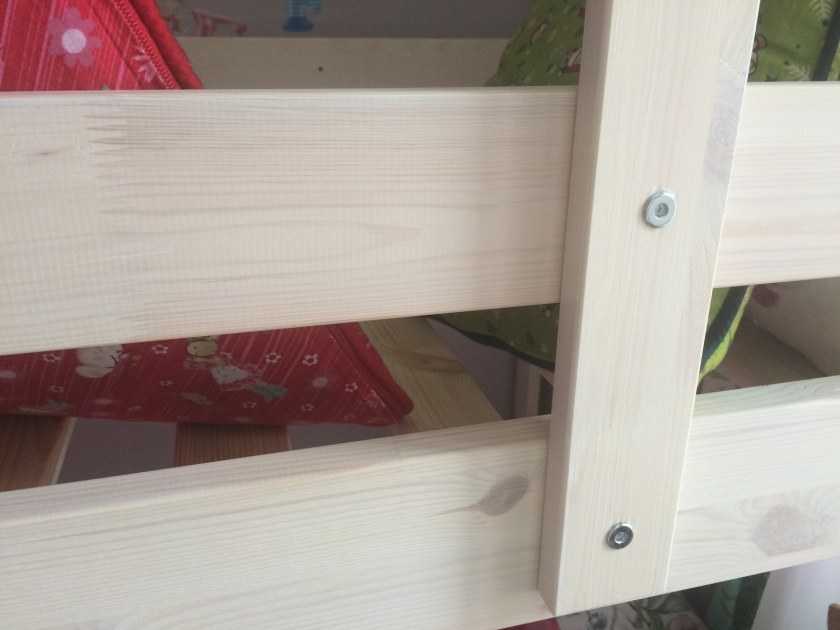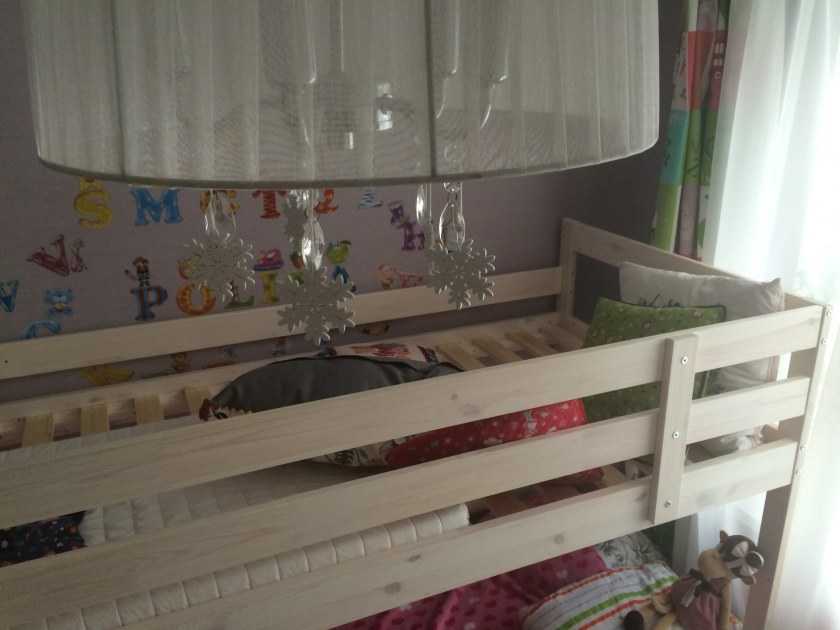 Высота ограждения детской кровати от 3 лет своими руками определяется из расчета толщины матраса. Бортик должен возвышаться над ним на 15-20 см. В месте расположения лестницы в ограждении выполняется просвет шириной около 80 см. Для изготовления бортов желательно использовать декоративную панель из МДФ или ДСП. Также можно оградить спальное ложе каркасом из деревянного бруса сечением 25х25 мм. Его стойки будут упираться в брус, на котором располагается реечное основание спального места. Они крепятся сквозными стяжками к ограждающему их коробу.