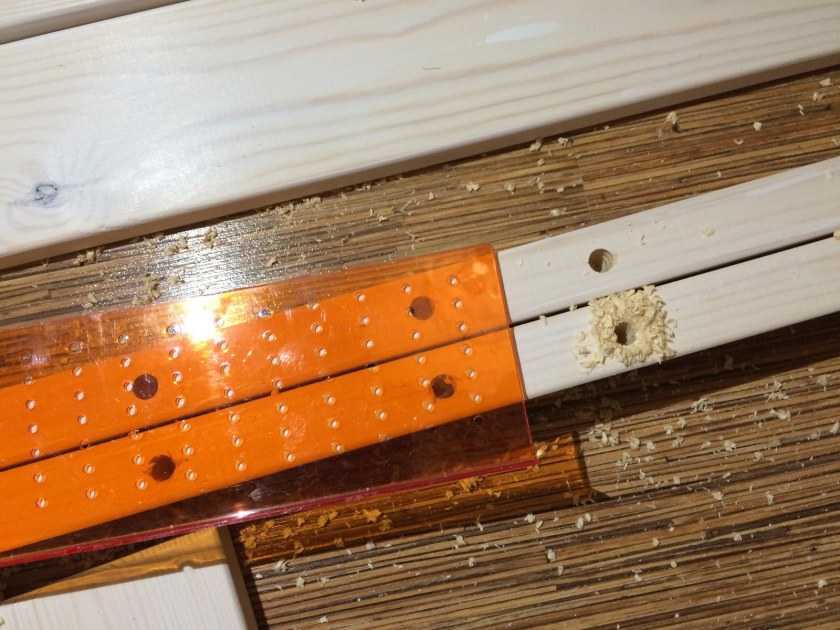 Также на расстоянии 50 см от пола связывают ножки будущей кровати деревянным бруском заподлицо с вертикальными стойками. Длина реек для обрешетки считается от нижней части обвязки ножек до их верхней точки вместе с высотой перил. Расстояние между двумя рейками 40 мм. Шаг между ними составляет 40 мм.