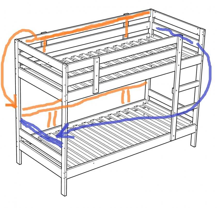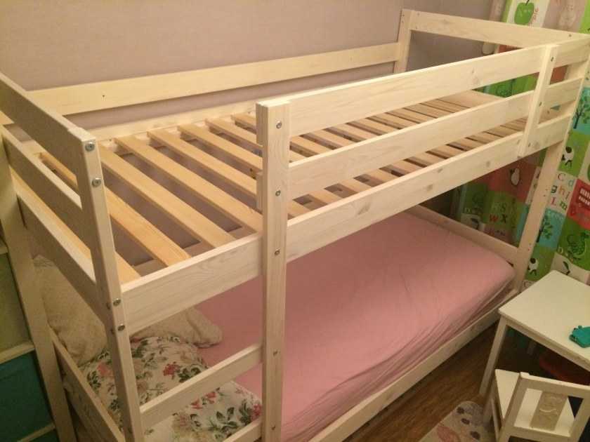 Если изготавливается детская кровать своими руками, то первоначально нужно произвести разметку, после просверлить отверстия для установки крепежных шурупов. Таким образом предстоит сделать отверстия для каждого винта, так как необходимо расположить их с двух сторон продольных брусков. Затем нужно осуществить крепление винтом, прижав нижний брусок к стенке. Такие же работы надо произвести и со второй стенкой опоры. На следующем этапе устанавливается верхний продольный брус доски, который необходим для укладки матрасов, в итоге вы должны получить опорную конструкцию. Поперечный брус укрепляется под будущую постель, эти манипуляции нужно произвести с верхним и нижним ярусами. Между брусьями должно быть обеспечено расстоянии 30 сантиметров.