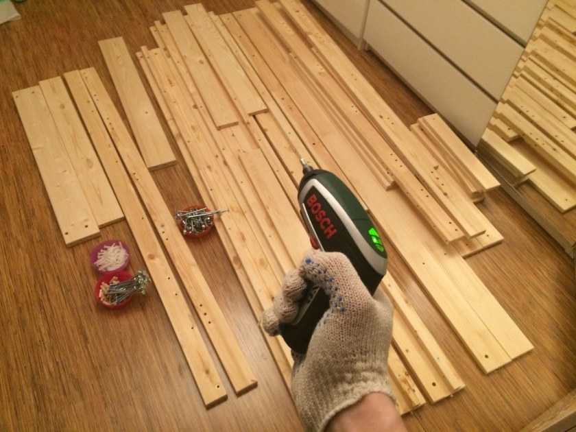 Следующим этапом изготовления односпальной кровати своими руками является установка ламелей. Для этого к продольным балкам конструкции крепятся поддерживающие планки, которые должны выдерживать вес человека. Они выполняются из деревянных брусьев квадратного сечения размером 4х4 см и крепятся на внутренней стороне боковин посредством саморезов. Далее к этим планкам параллельно друг другу на одинаковом расстоянии фиксируются рейки с помощью металлических уголков.