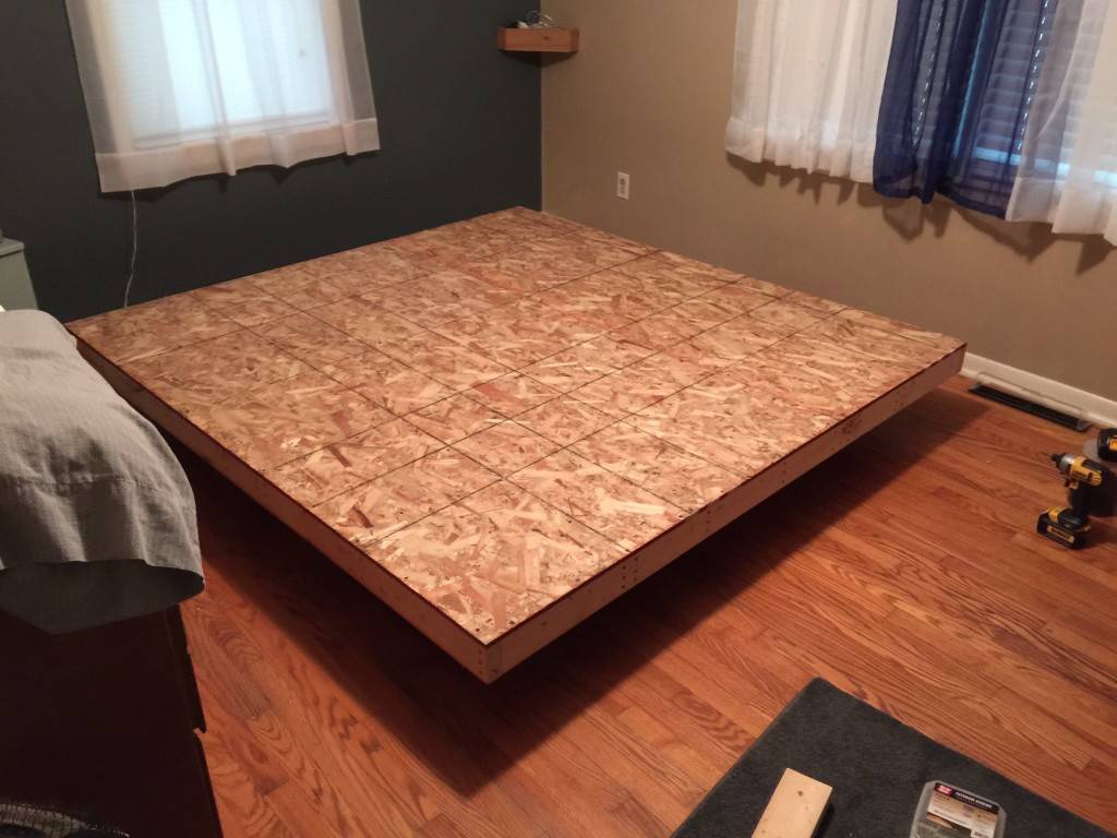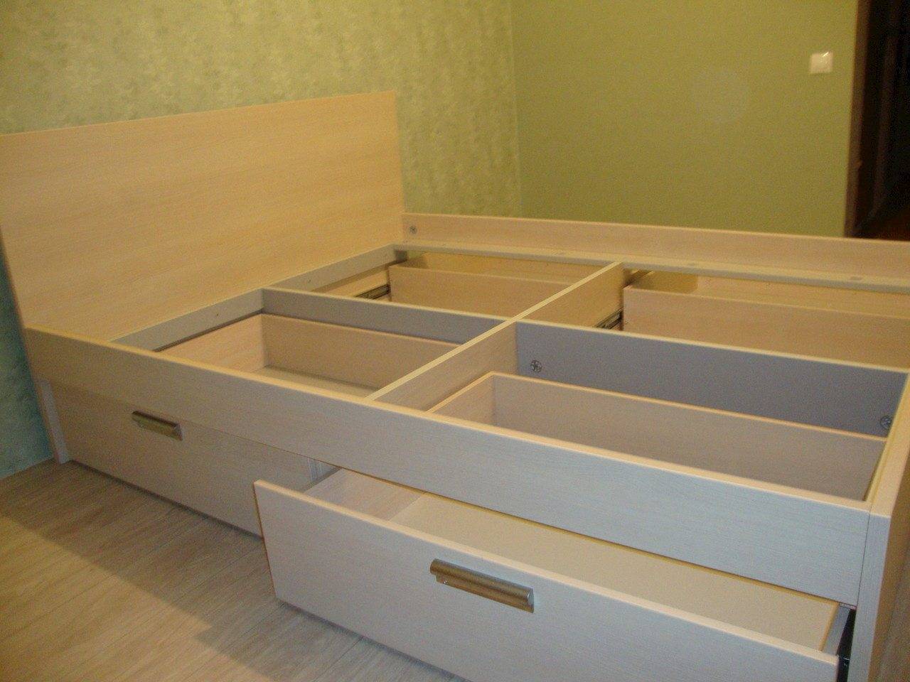 Когда короб сделан, к низу нужно прикрепить лист ДВП, который послужит днищем отдела для хранения вещей. Параметры листа равны размерам самого короба по горизонтальной площади. Доступ к получившемуся пространству может обеспечиваться за счет поднятия матраса либо если изготовить в корпусе отсеки для ящиков.