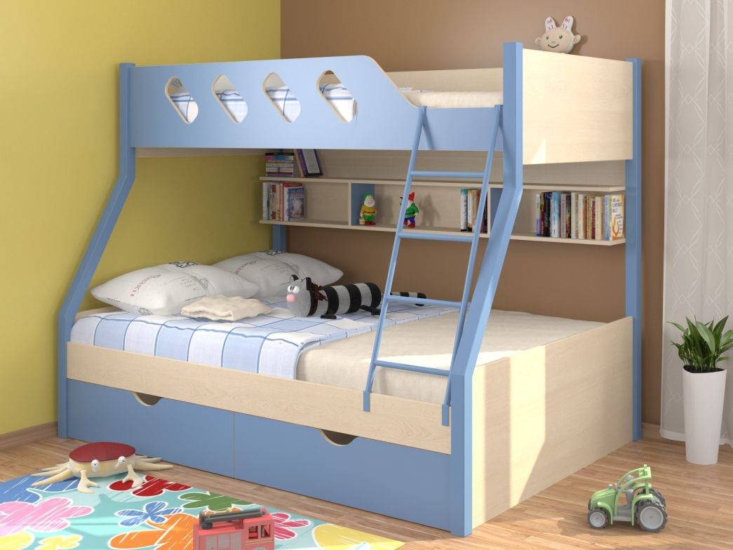 Спальные места находятся вдоль одной стены, но не друг над другом, а сдвинуты. Этот вариант дает возможность более рационально использовать имеющееся пространство — заполнить его от стены до стены.