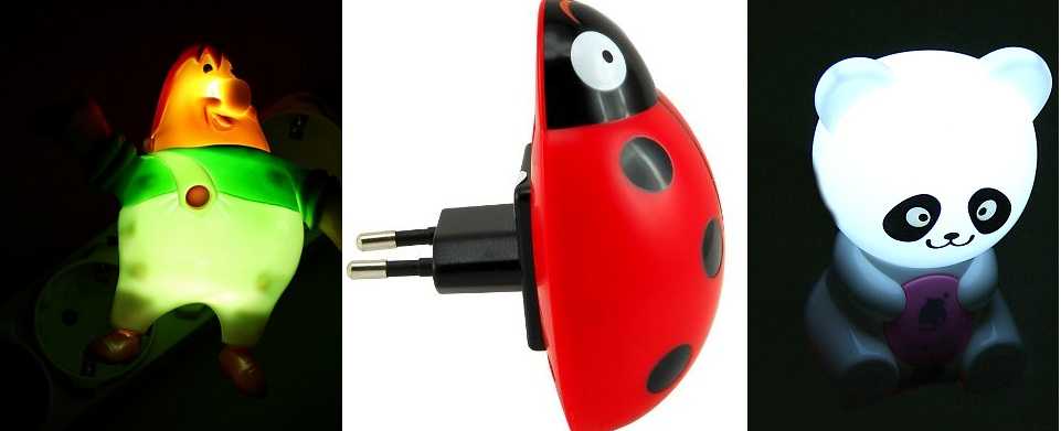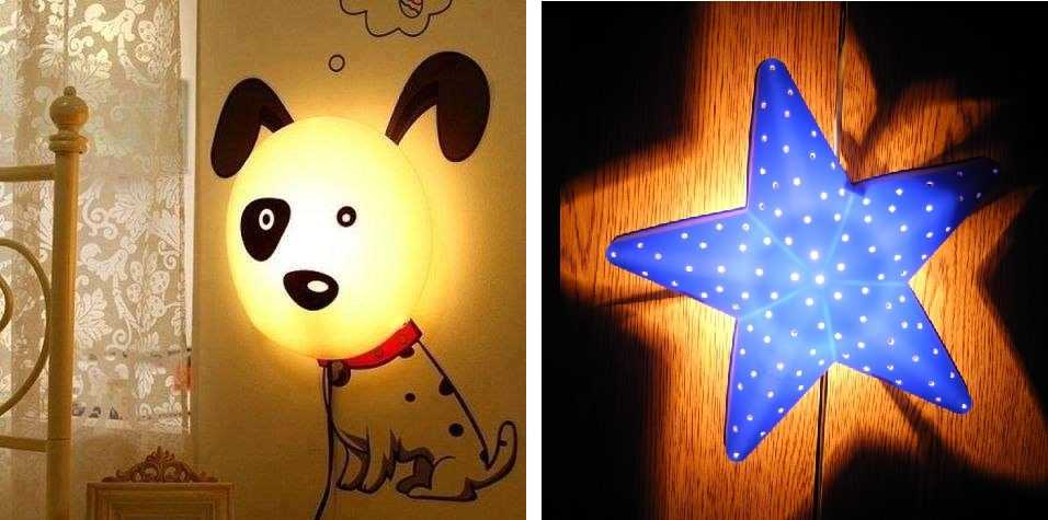 Разновидности. Существует несколько видов детских ночников, среди которых популярностью пользуются следующие: ночник в розетку – бюджетный вариант, к достоинствам которого относится безопасность, так как отсутствуют провода. Но есть и минус – маленькая площадь освещения; универсальные светильники – модели с регулировкой яркости. В вечернее время служат обычной настольной лампой, а ночью выполняют роль ночника; светильники с датчиками звука, движения – идеальны для спальни младенца, так как самостоятельно включаются и выключаются, реагируя на плач малыша или шаги мамы; светильники-проекторы не только освещают комнату, но и помогают ребёнку настроиться на сон, перемещая по стенам и потолку красивые изображения животных, звёзд, мультяшных персонажей и т. д.; светильники с ионизацией отлично подойдут для детей, страдающих аллергией. Это может быть, например, соляная лампа, которая не только даёт свет, но и очищает воздух внутри помещения.