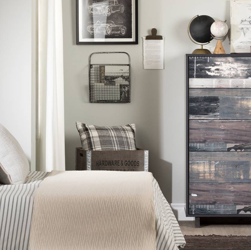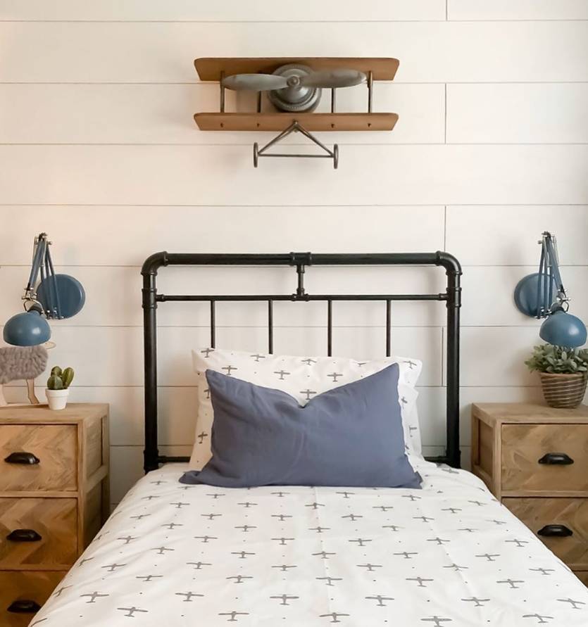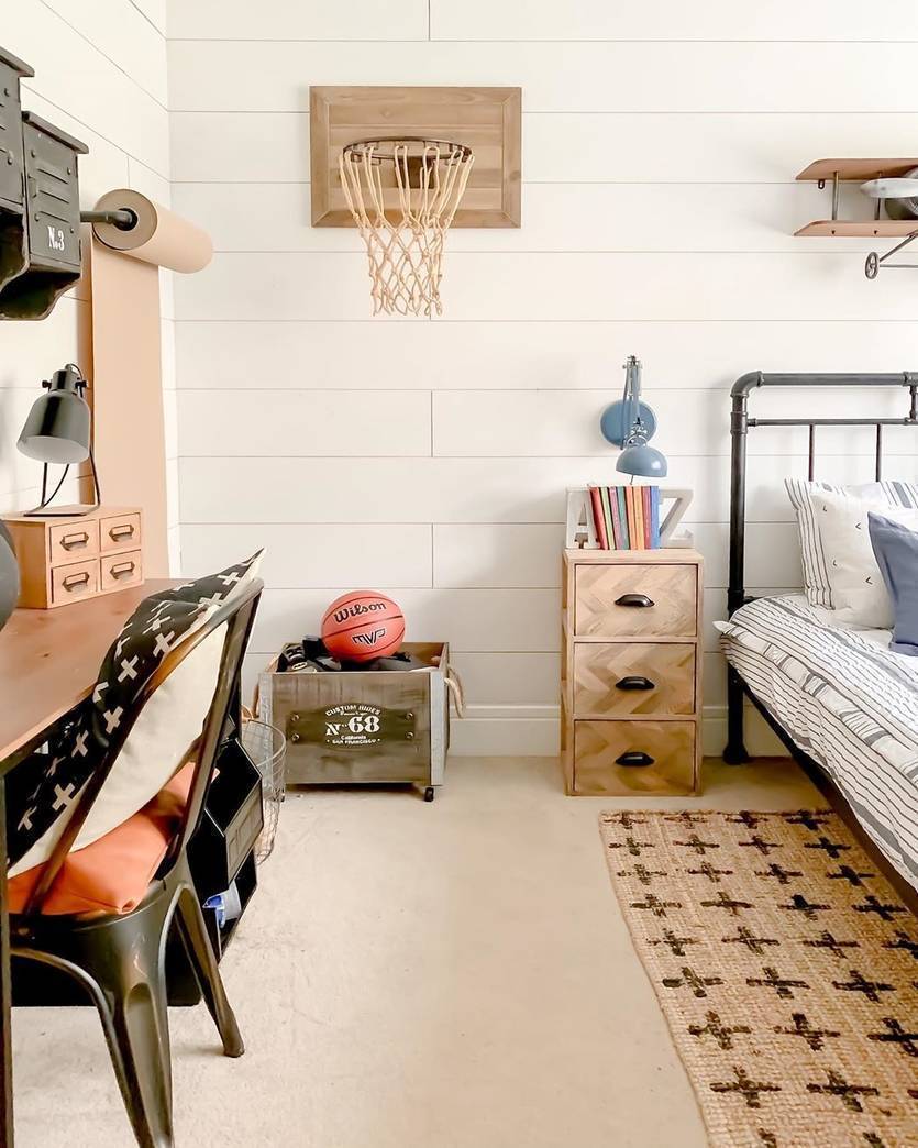 Мальчики больше любят строгую классику с применением каких-то необычных материалов, элементов декора. Идеи можно почерпнуть в интернете, либо придумать что-то свое. Можно, например, старый велосипед покрасить и повесить на стену в виде декора, заказать огромный стеллаж и хранить на полках коллекционные машинки, фигурки супергероев, ну или книги. Вариантов много.
