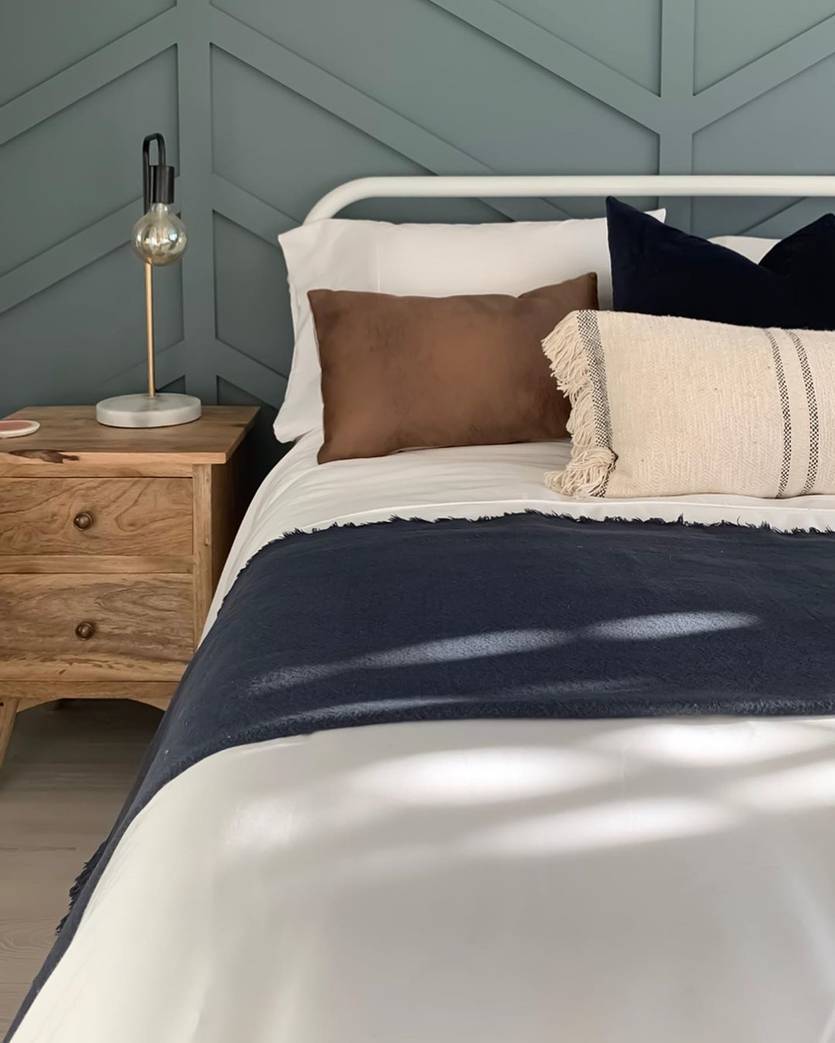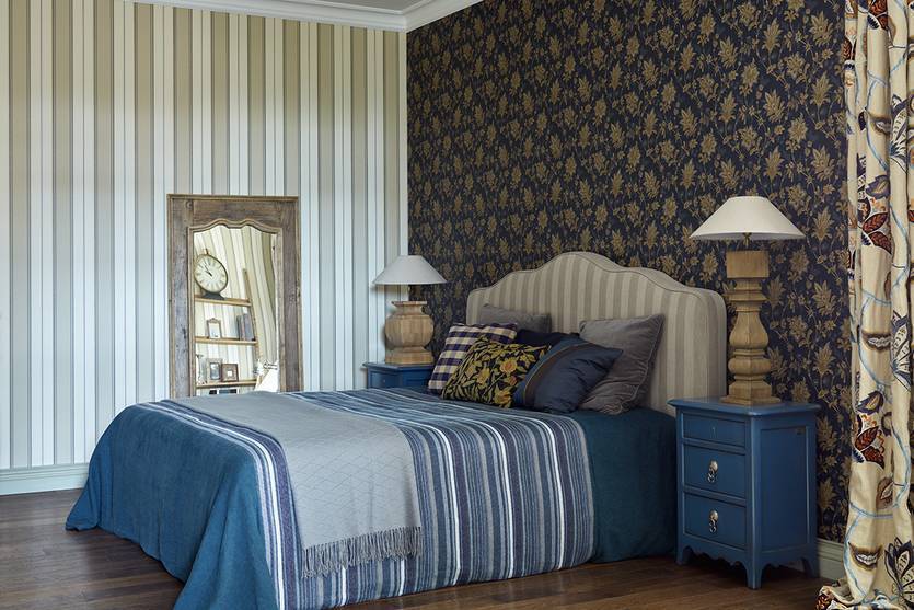 Исправить пропорции вытянутой и узкой комнаты можно за счет яркого оформления одной из стен. С помощью мелкого принта или неброского орнамента помещение обретет объемность.