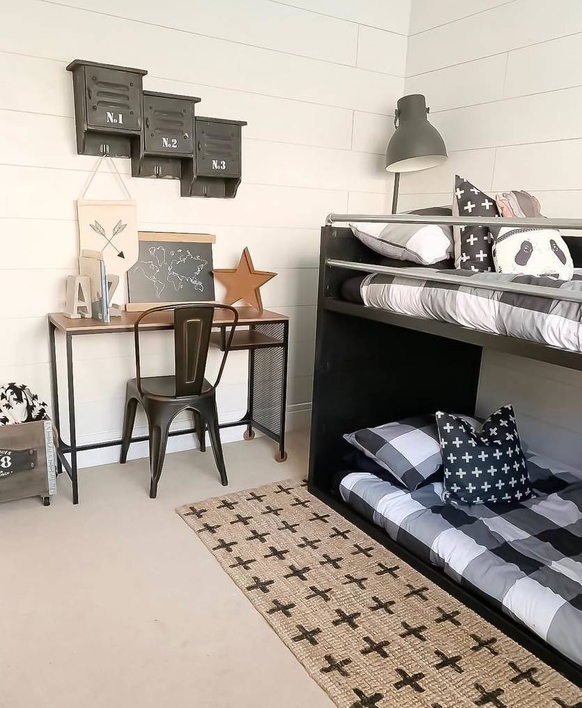 В этой комнате преобладает минимализм: строгие и четкие формы мебели, сдержанная цветовая палитра и максимальная функциональность. Помещение небольшого размера, но родители разместили в ней две кровати, бельевые ящики, шкаф и два рабочих места. Дополняет минимализм яркий коврик в черно-белую полоску.