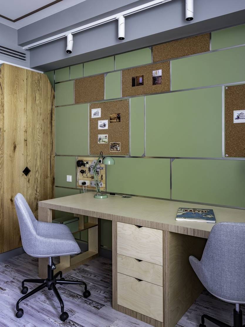 Продолжение комнаты: ближе к окну находится рабочая зона. Единственный минус обстановки – отсутствие шкафа для хранения вещей. Пока его успешно заменяет небольшой бельевой шкаф, расположенный напротив рабочих столов.