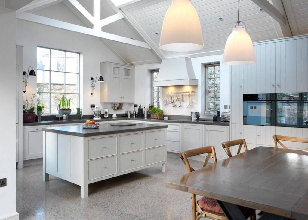 Простота и белый цвет — два принципа, на которые надо ориентироваться при выборе отделки для потолка на кухне в скандинавском стиле. Массивные украшения, лепнина будут смотреться совершенно не к месту, особенно на маленькой кухне, например, в хрущевке. Максимум, который можно себе позволить, — небольшой однотонный прямой плинтус по периметру потолка.