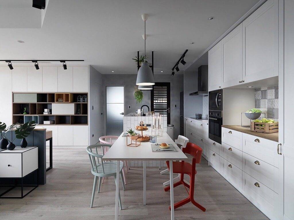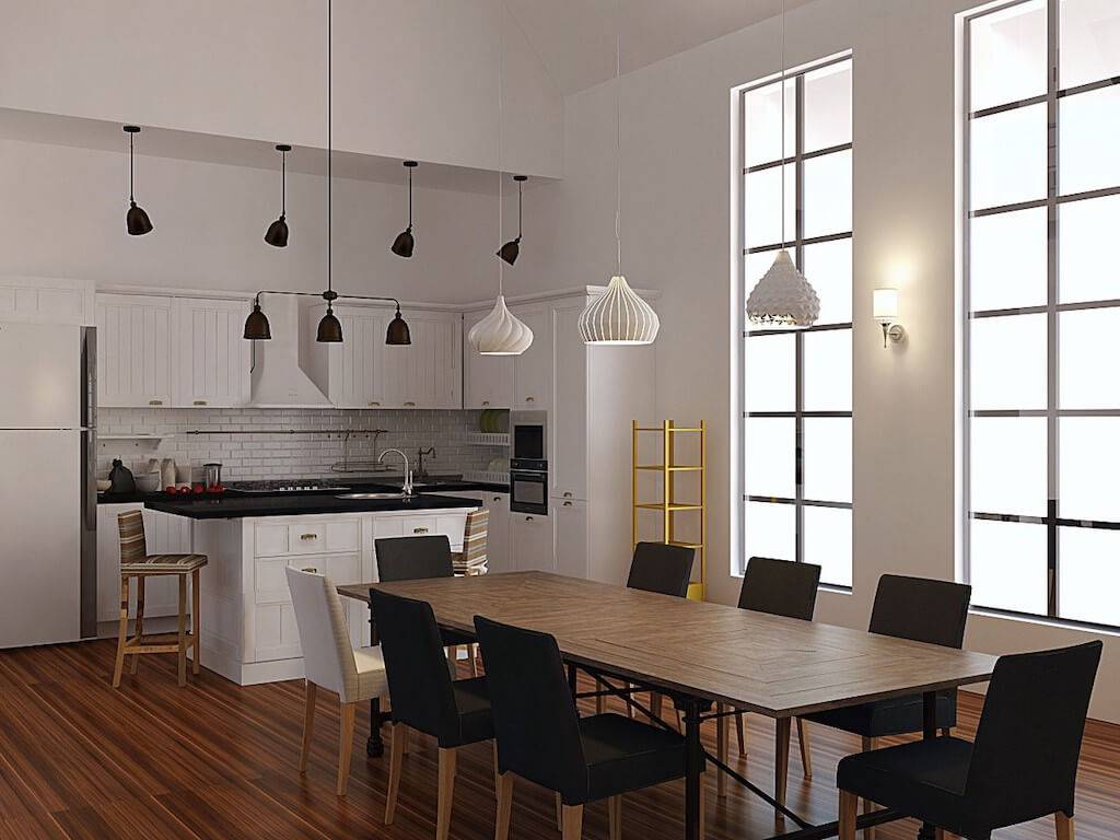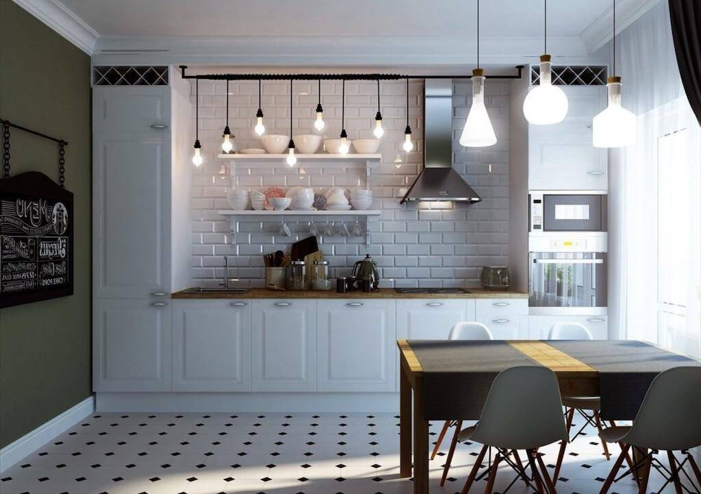 Необычные светильники в стиле лофт на кухне в скандинавском стиле.