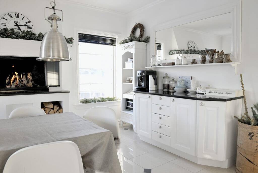 Скандинавский стиль в идеале строится на контрасте белого и темных глубоких оттенков. Но на маленькой кухне такое сочетание будет смотреться слишком тяжело и дополнительно уменьшать комнату, поэтому в отделке лучше отдавать предпочтение светлым материалам, а контраст добавлять в декор — это беспроигрышный вариант интерьера.