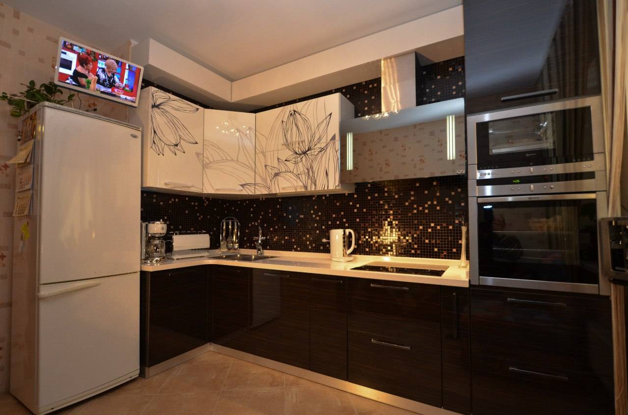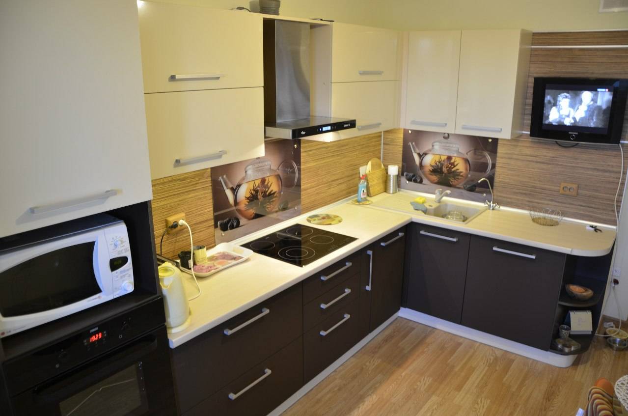 Достоинства Г-образной кухни: в помещении без труда организовывается полноценная обеденная зона, также можно встроить всю необходимую бытовую технику.