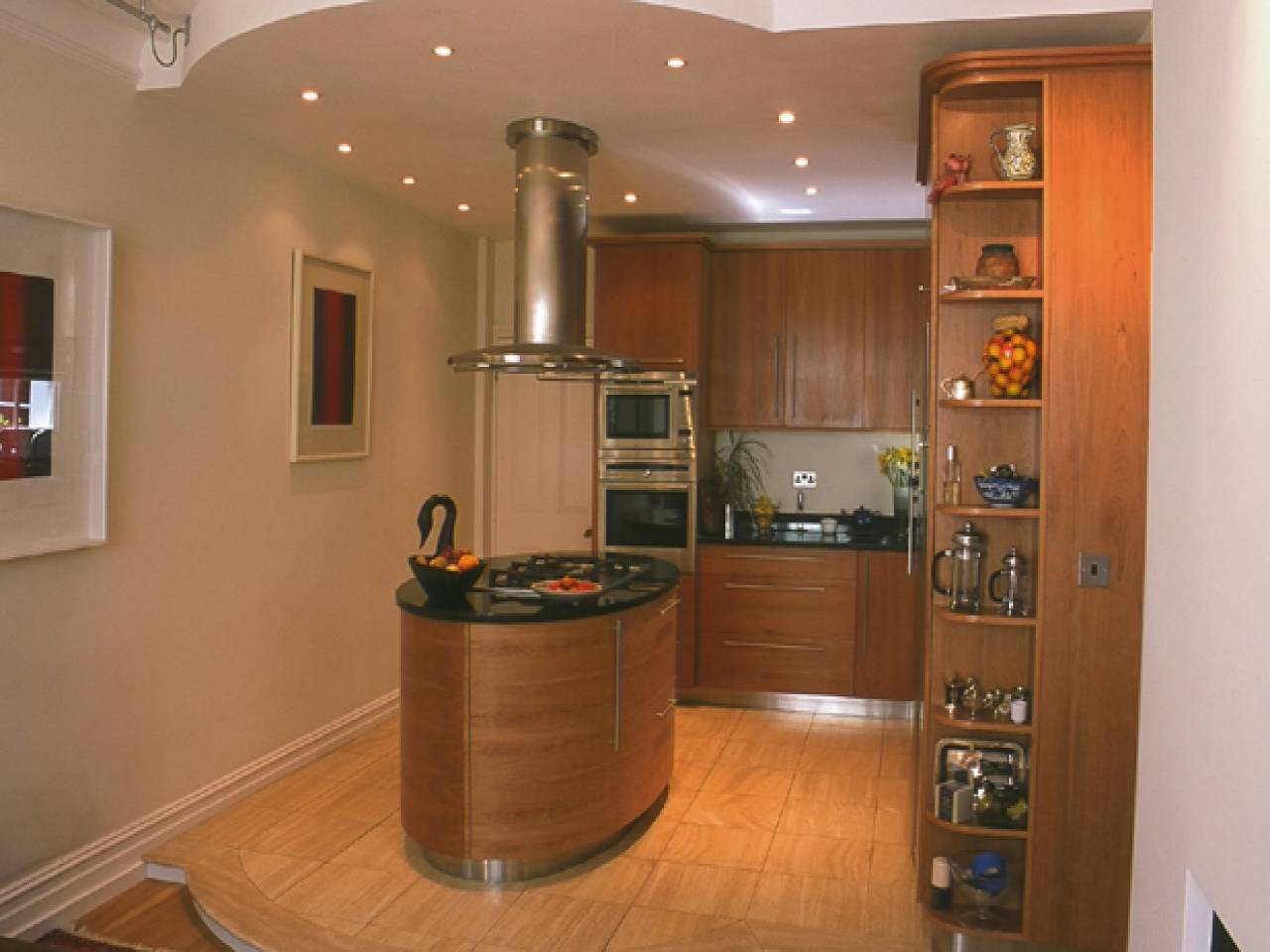 Холодильник часто выносится за пределы комнаты, это тоже вариант, но тогда нарушается эргономика. Рядом с ним должна быть поверхность для выкладки продуктов, затем рядом будет мойка, после нее столешница для нарезки и прочей подготовки еды. Заготовки одним движением руки подвергаются обработке на плите или, чуть дальше, микроволновой печи, духовке.