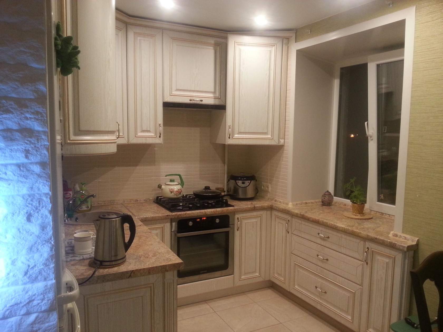 Г-образный. Под гарнитур используется две смежные стены. Угловой комплект расширяет рабочую секцию и корректирует форму комнаты. Подоконник можно использовать в качестве обеденной зоны, увеличив его размер. Или сделать в стене нишу и спрятать крупную бытовую технику – стиральную или посудомоечную машину.