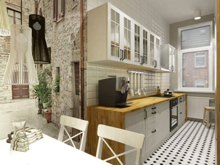 Маленькая кухня требует опытного размещения всего оборудования. Кухонная мебель должна быть устроена так, чтобы можно было удобно готовить еду. Наиболее популярным является L-образное расположение, поэтому мебель расположена на двух стенах, что обеспечивает легкий доступ к холодильнику, раковине и плите. L-образное пространство достаточно универсально, чтобы вы могли легко использовать его в помещениях с особыми требованиями (например, в узкой кухне).