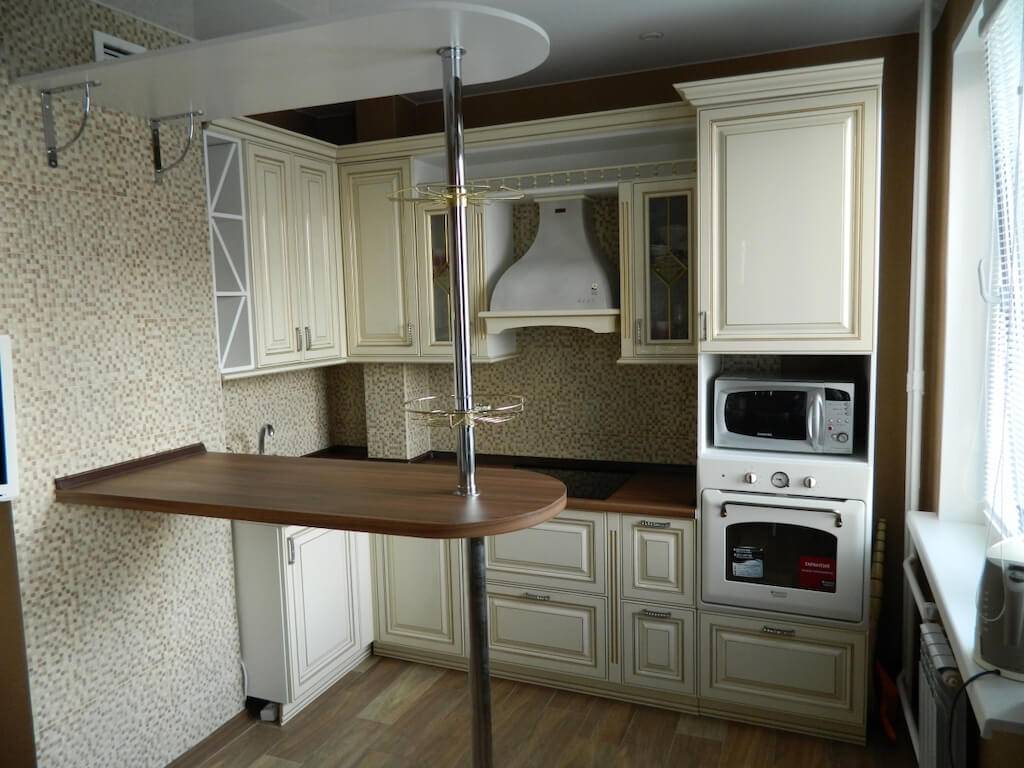 Для маленьких кухонь рекомендуется решение с выдвижной стойкой. Это позволяет экономить пространство. А узкую кухню украсит пристенный вариант барной стойки. Она может заменить обеденный стол.